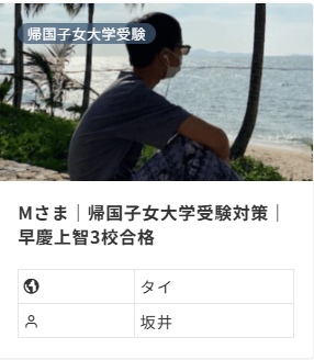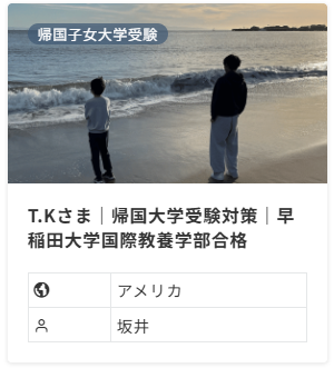 | 相談内容 | アメリカに10年在住、英語はネイティブレベル。 引っかけ問題などSAT Englishに若干の苦手感あり。 慶應PEARL早稲田SILSなどの受験用にSAT高得点を目指したい。 現地校を3年で早期卒業、通常より1年早くSAT本番を迎える点を心配していた。 |