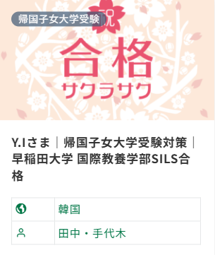 | 成果 | 580(4月)→ 700点(11月)120点アップ!! 苦労しながらも諦めずに4回目まで受験し、700点取得! コツコツと地道な努力を重ね、SATに挑めた。 |