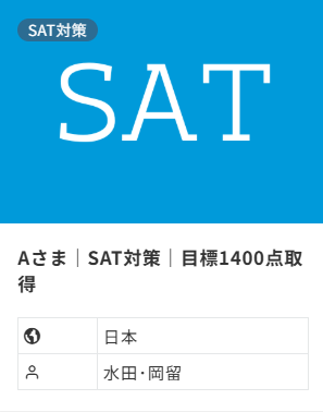 | 提案 | 英検準1、TOEFL、1級、TOEFL、SATの順に対策を伴走する。 SAT対策を始める前に、TOEFL対策を経由し英語力アップを目指した。 |