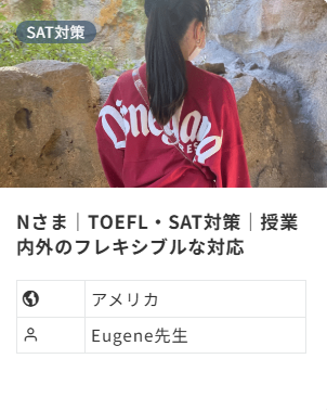“最初は何から手をつければいいのか分からなかったSAT対策ですが、田中先生が自分の弱点をすぐに見抜いて、効率のいい学習プランを組んでくださいました。その結果、自分に合った方法で学ぶことができ、最終的にスコアが140点も上がりました。紹介していただいた学習サイトもかなり役立って、自宅での勉強もスムーズに進められました。”—生徒様