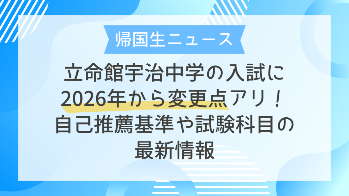 立命館宇治中学校への進学を検討されている海外在住・帰国生のご家庭にとって、入試制度の変更は非常に大きな関心事です。2026年度(令和8年度)入試において、立命館宇治中学校は「より多様な背景を持つ生徒を迎え入れる」ことを目的とし、複数の重要な変更を発表しました。