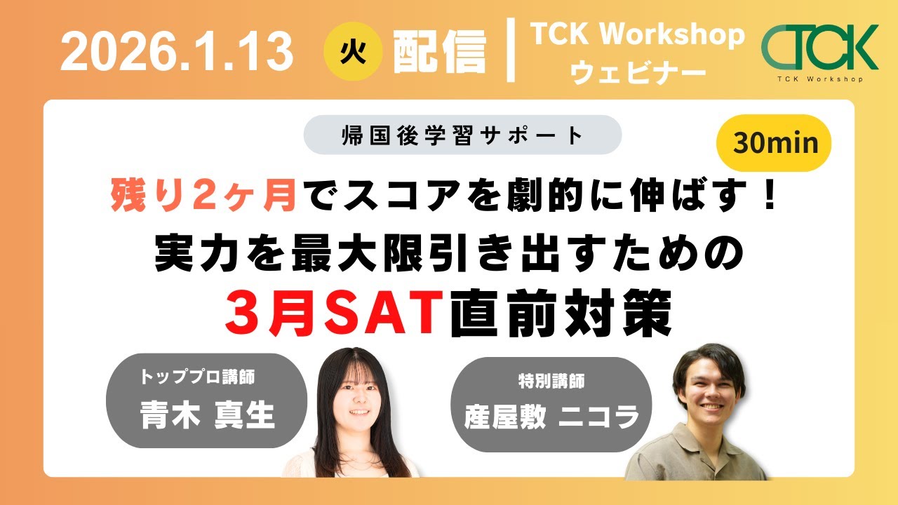 この記事は、こちらのウェビナーを基に作成しています。TCK Workshop主催のウェビナーでは、指導経験豊富な講師が実際の指導を通して蓄積した帰国生の受験、英語学習などについての情報を、それぞれの時期に合わせて毎週お伝えしておりますので、ぜひご覧ください。