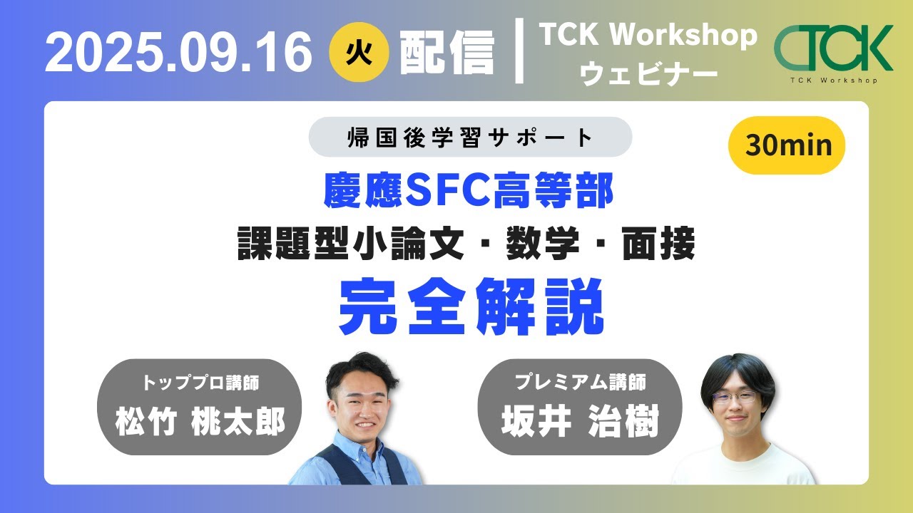 この記事は、こちらのウェビナーを基に作成しています。TCK Workshop主催のウェビナーでは、指導経験豊富な講師が実際の指導を通して蓄積した帰国生の受験、英語学習などについての情報を、それぞれの時期に合わせて毎週お伝えしておりますので、ぜひご覧ください。