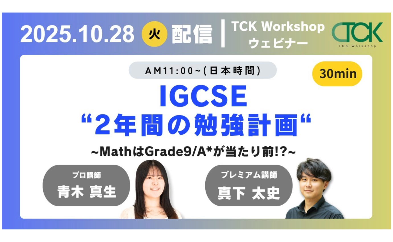 TCK Workshopでは、IGCSE対策からその先の大学受験までを見据えたトータルな学習支援を提供しています。現在の学習状況に不安がある方や、より高いスコアを目指したい方は、ぜひ一度無料学習相談にお申し込みください。