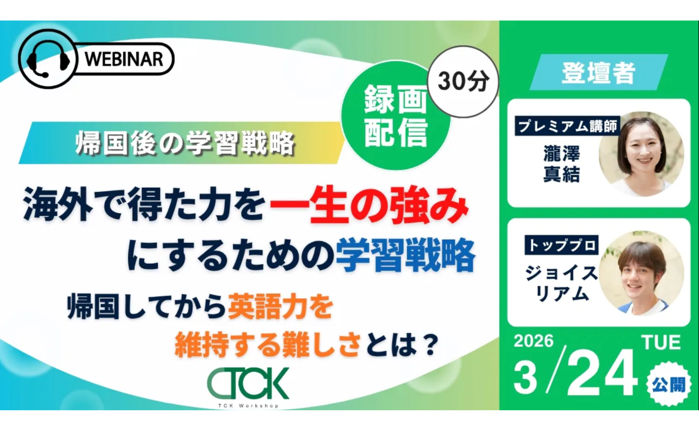 この記事は、こちらのウェビナーを基に作成しています。TCK Workshop主催のウェビナーでは、指導経験豊富な講師が実際の指導を通して蓄積した帰国生の受験、英語学習などについての情報を、それぞれの時期に合わせて毎週お伝えしておりますので、ぜひご覧ください。